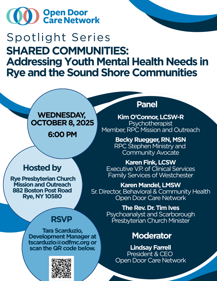 Join RPC Mission & Outreach, in conjunction with Open Door Care Network, for an engaging panel discussion to raise awareness about the mental health concerns of youth, and to highlight resources for low-income youth and their families in our neighboring communities. The panel will focus on the increasing demand for mental/behavioral health care and barriers to access faced by many community members; the ways in which Open Door and other community resources are identifying and responding to escalating mental health needs in our community; and how shared connections provide the safety net in our communities.